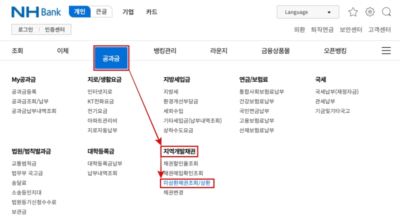 - NH농협: 공과금 → 지역개발채권 → 미상환채권조회/상환